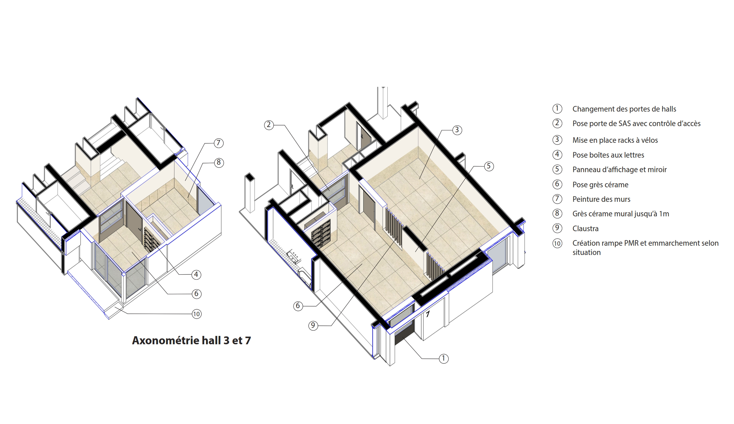 Pour pallier l’impression d’étalement des barres, nous cherchons à provoquer un effet d’élancement et redécoupage à une l’échelle de tissu plus stratifié avec des ruptures franches dans la linéarité. De grands cadres blancs structurent ainsi le quartier et rythme les entrées d’immeubles, entre les cadres pleins, les flux humains.