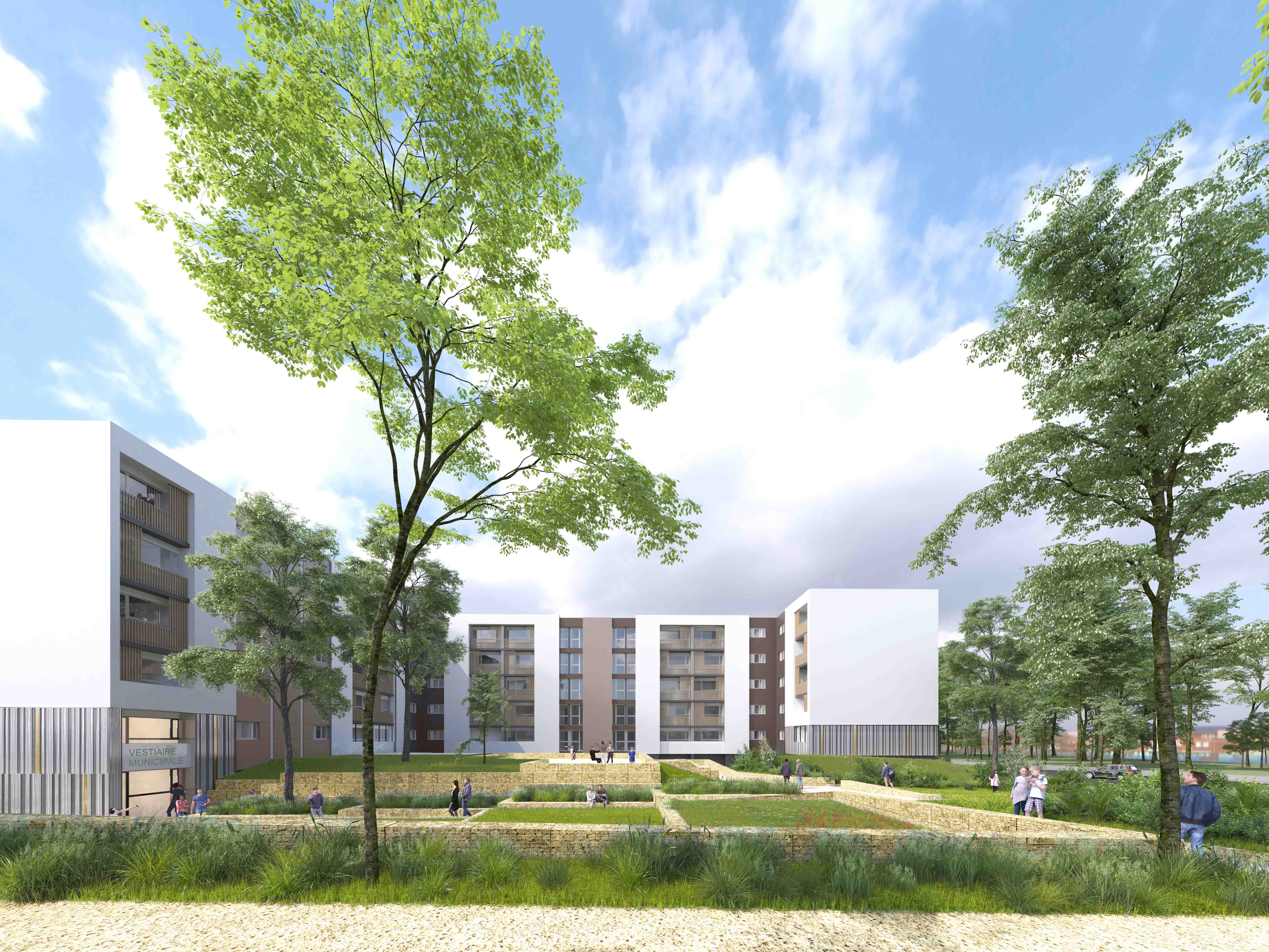En échos avec la réhabilitation, le traitement paysager propose d’ouvrir au regard, les Rez-de-jardin et l’accueil des associations en implantant des jeux de terrasse et des poches de verdures soutenus par des murets de gabion.