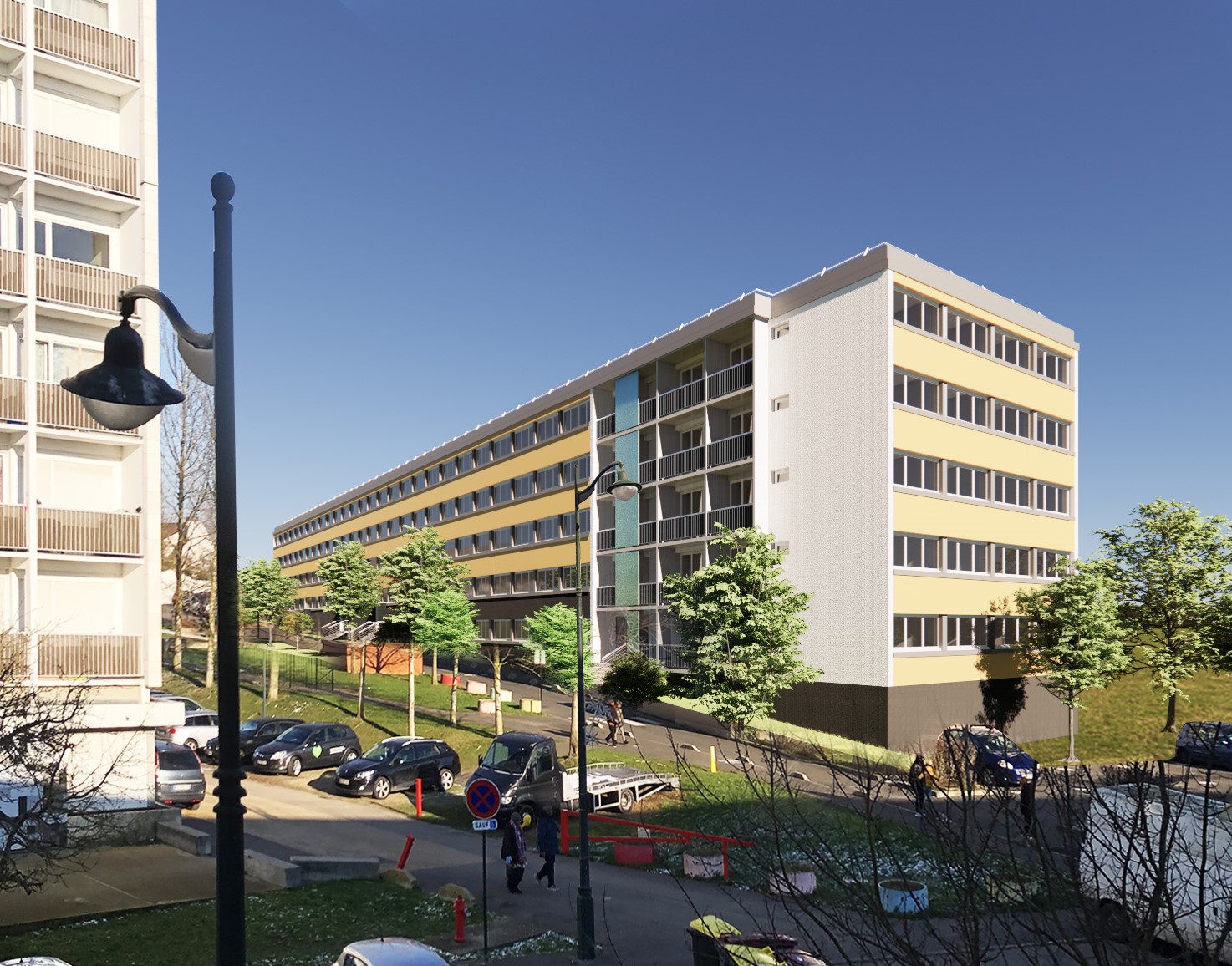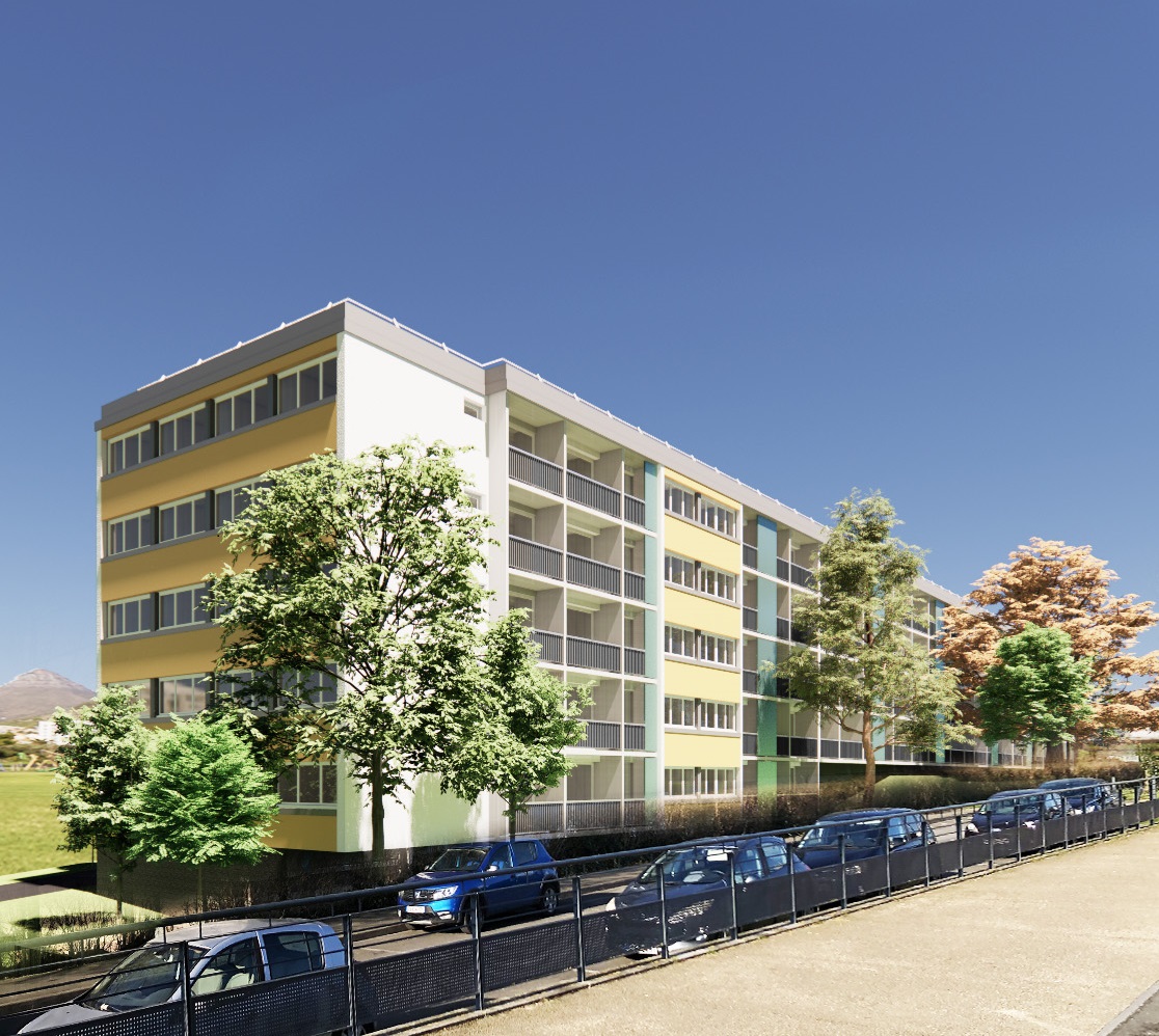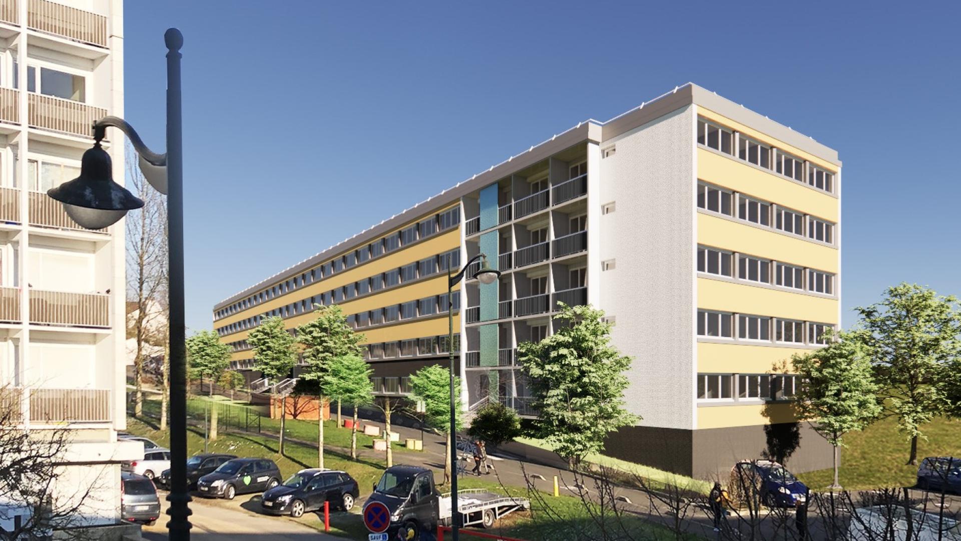 Réhabilitation énergétique : travaux sur le clos et couvert (ITE, toitures terrasses, menuiseries extérieures), les parties privatives (électricité, pièces humides, portes palières) et communes (halls, cages d’escaliers, vidéosurveillance, espace d’accueil