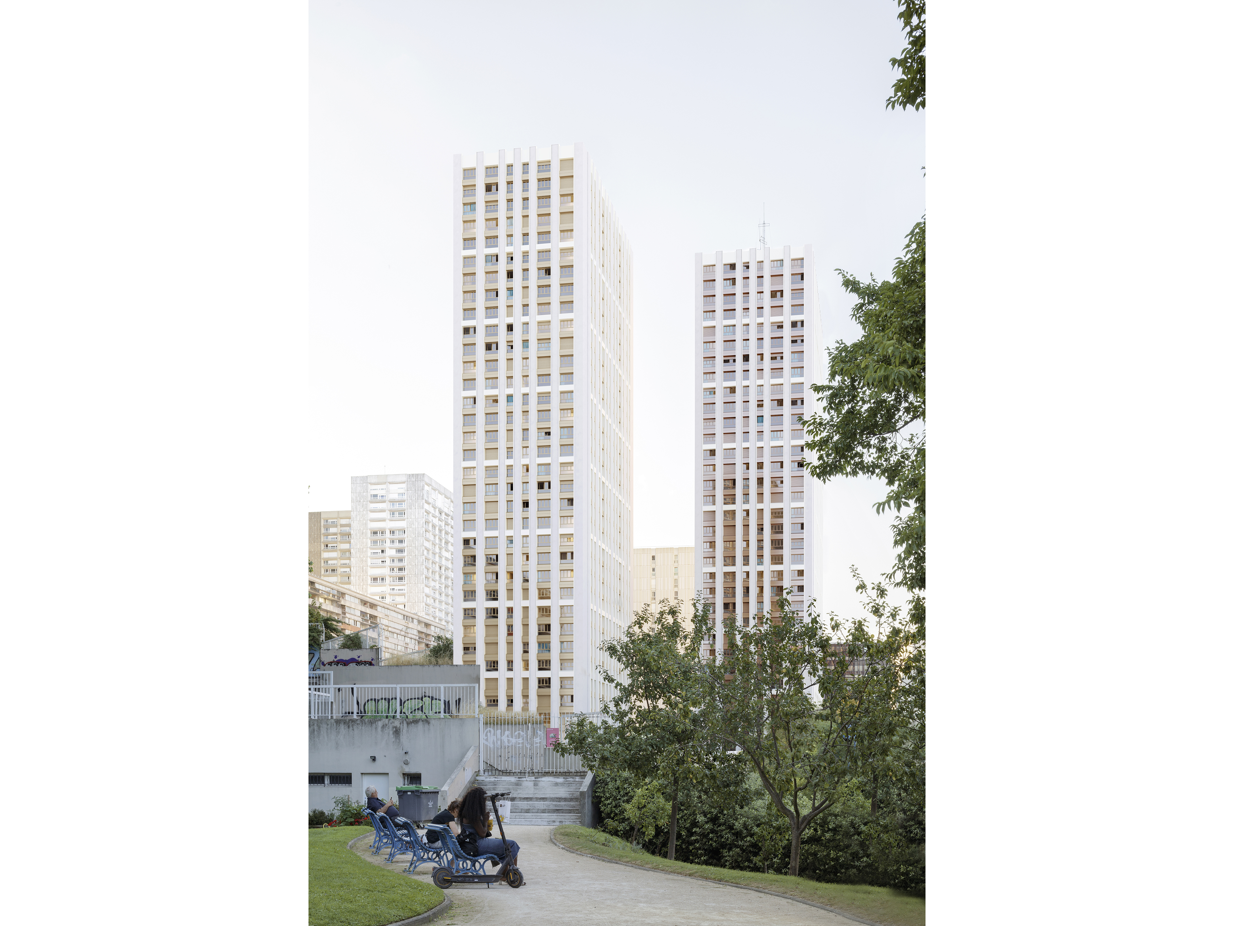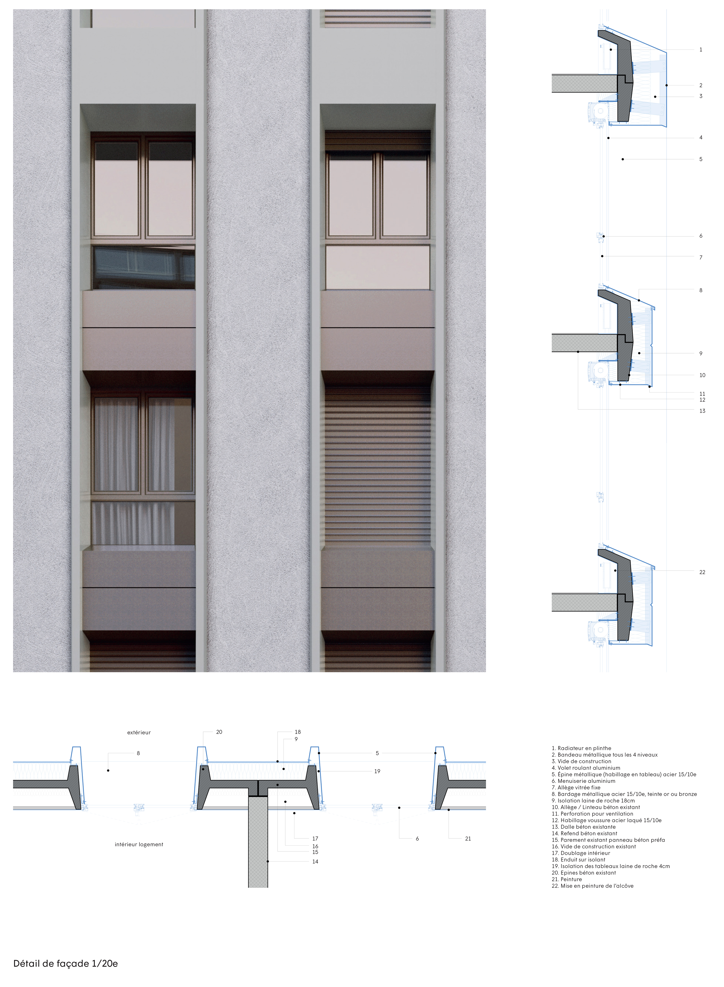 Notre projet propose un redécoupage ponctuel de la grande hauteur par « la mise en avant », tous les quatre niveaux, de l’ensemble allège/voussure qui se déporte au nu des épines et prend une teinte claire se rapprochant de celui-ci. Cela rythme les façades par un jeu de bandeaux horizontaux et crée des sous-ensembles d’échelle plus «domestique», c’est une sorte d’ordre interne à la façade. Aujourd’hui les tours semblent un empilement vertical infini de fenêtres, le nombre de niveaux est impossible à appréhender. Ce dispositif de bandeaux atténue l’effet « grande hauteur ».