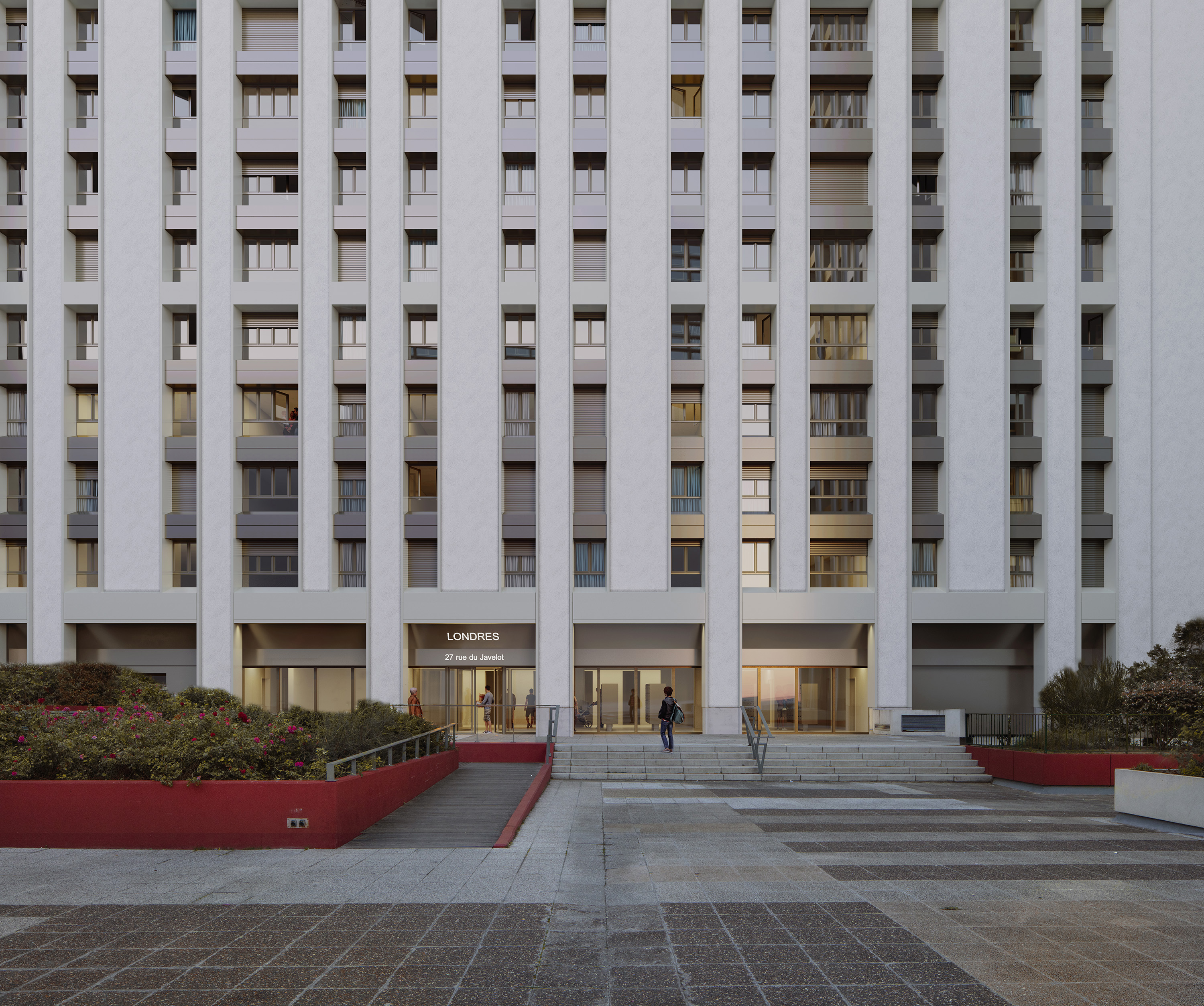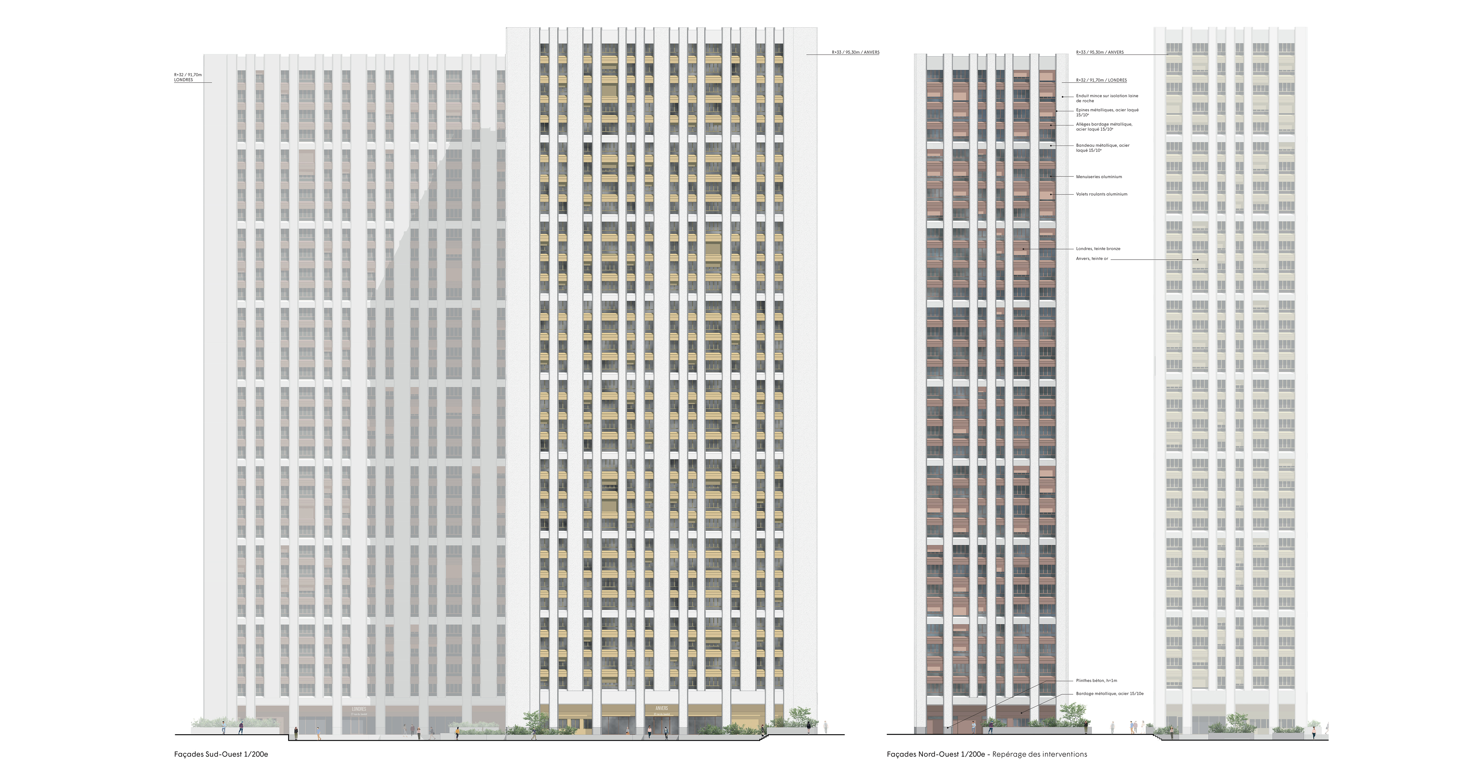 Aujourd’hui les deux tours sont totalement identiques d’aspect, de fait il est très difficile de les distinguer. Nous proposons donc d’introduire une variation de teinte dans certaines parties des façades : les allèges et voussures (de couleur abricot aujourd’hui). Dans notre projet leur capotage métallique est doré sur Anvers et bronze sur Londres, les menuiseries aluminium sont raccord. Outre le fait que le bronze et l’or sont délicatement différents et complémentaires, c’est également un clin d’œil aux matières des médailles olympiques.