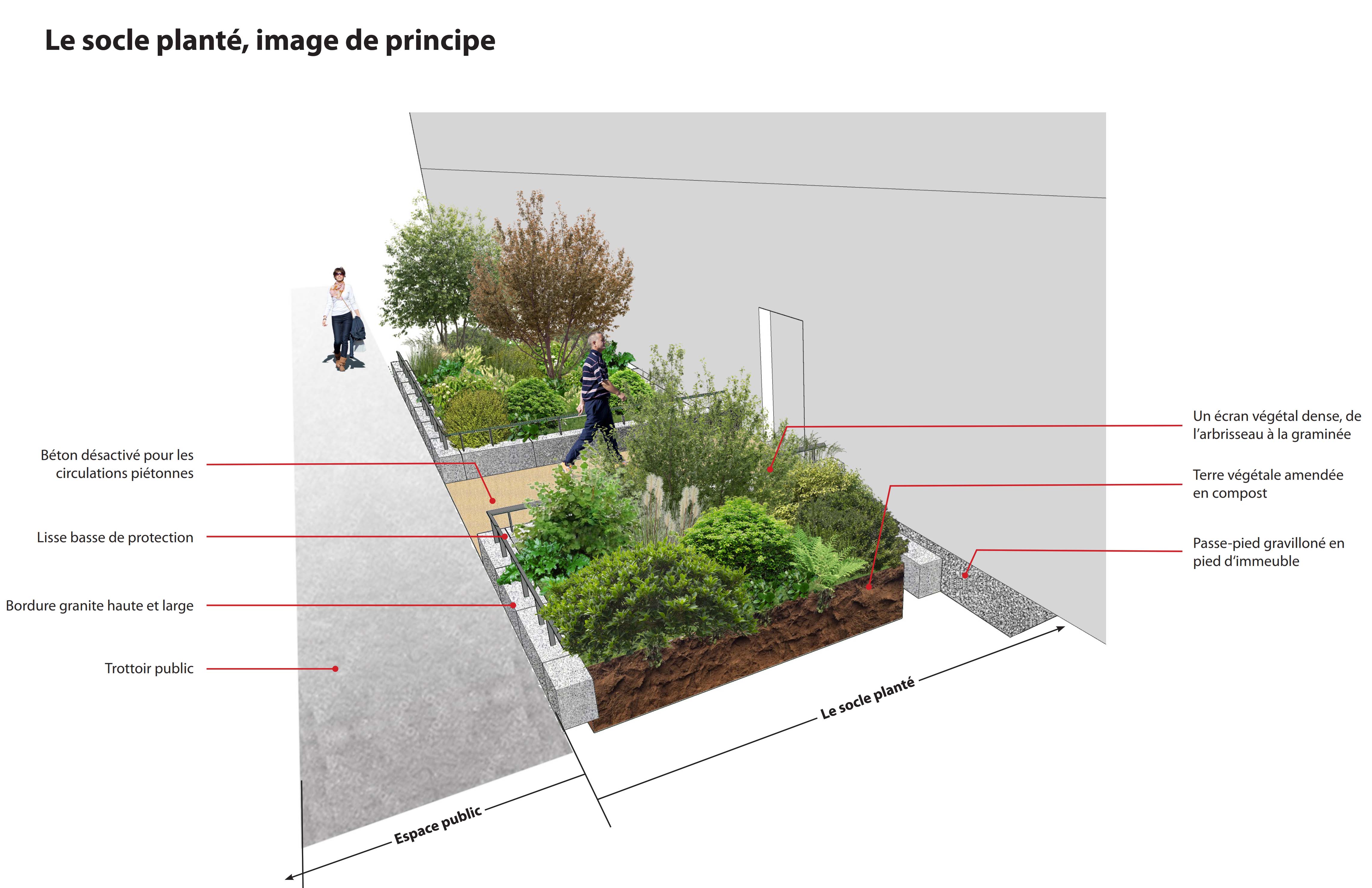 En liaison avec le quartier, les pignons sont agrémentés d’un texte subtilement engravé dans l’enduit, créant l’évènement du côté des espaces publics. Référence directe au quartier des écrivains et du nom des rues, la typographie joue ici le rôle d’ornementation pour rappeler les grandes horizontales des bâtiments. Portant des textes poétiques, les pignons se tournent maintenant à un paysage plus urbain et contemporain. La sélection des textes d’auteurs classiques pourra être l’occasion d’ateliers participatifs avec les habitants.