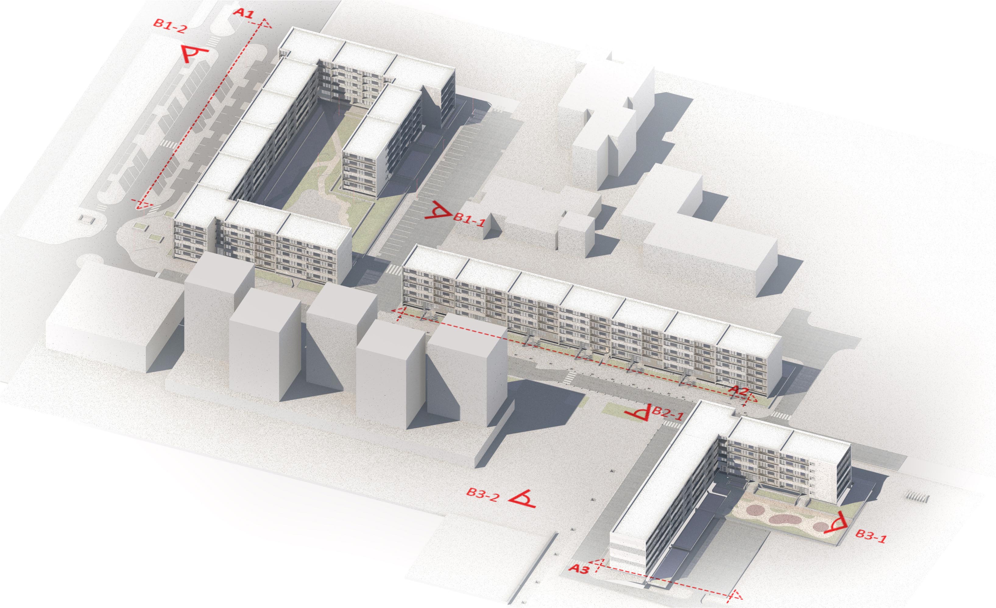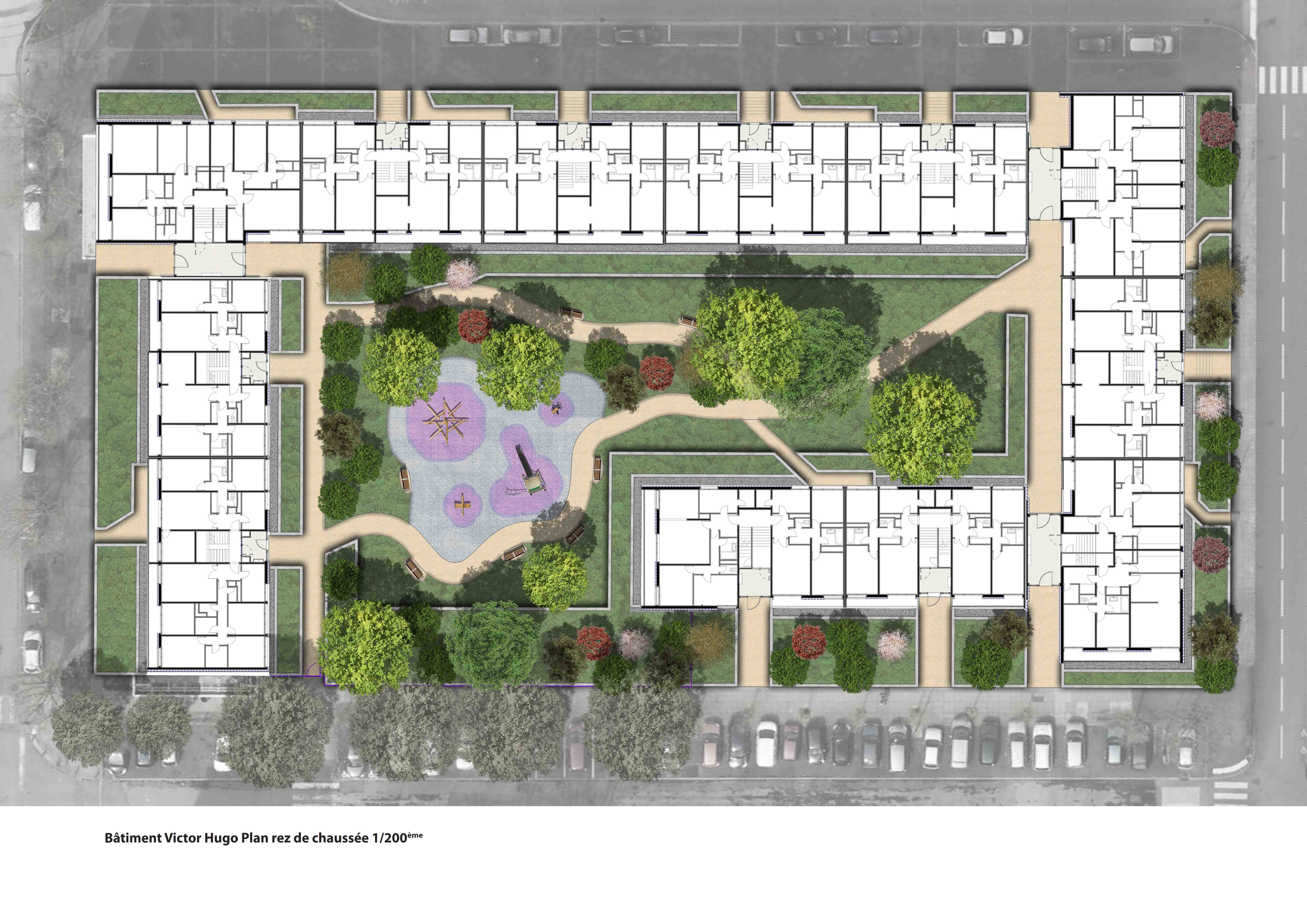 Le programme porte sur trois grands bâtiments tous relativement similaires en conception : rue Victor Hugo une barre qui forme ilot (barre 1), une barre ferme sur la rue Anatole France (2) et une barre en L (3) côté Edmond Rostand, toutes trois sont en R+4. Edifiés en 1965 sur un principe constructif en béton préfabriqué typique des années 60’ l’ensemble souffre d’un vieillissement flagrant et s’impose dans ce paysage du méandre de l’Yerres.