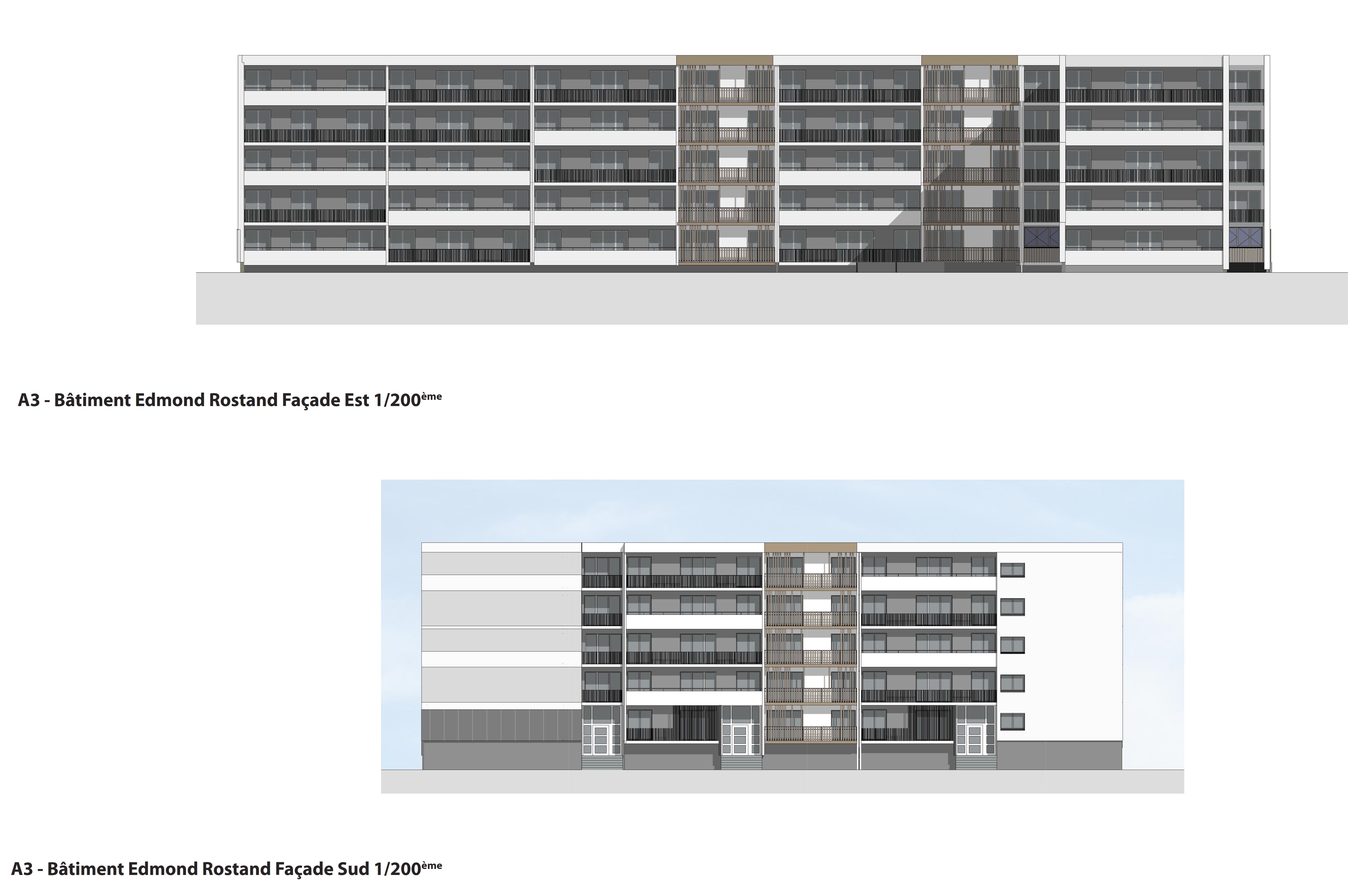 Nous donnons une sensation de légèreté à l’ensemble en le décollant du sol par un soubassement foncé. Une attention toute particulière est donnée aux gardes corps. Ils attirent l’œil sur le jeu d’ombre en fond de balcon et donnera la personnalité à la résidence. D’une grande sobriété, ils sont de typologies différentes selon le nouveau découpage des bâtiments, par cage d’escalier : barreaudage métallique gris, claustrât simili bois et garde-corps plein. Le choix de décliner les mêmes matériaux sur l’ensemble de la résidence affirme une unité urbaine.